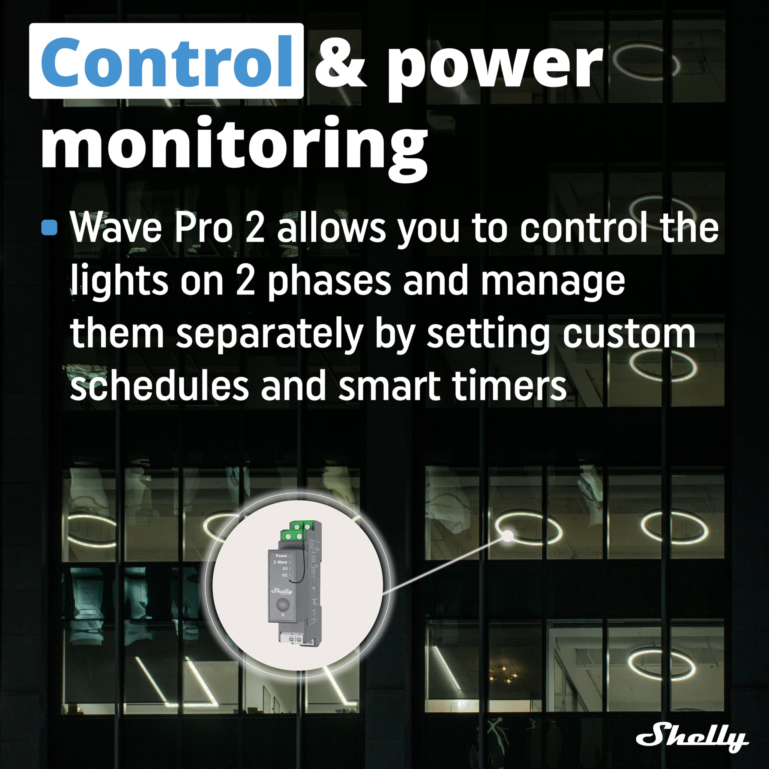 - Control lighting on 2 phases with Shelly Wave Pro 2 US - Automate and optimize energy use with custom schedules and timers. Set lights to turn off after work and switch back on only where needed at 7:00 AM, ensuring efficiency and preventing forgotten lights.